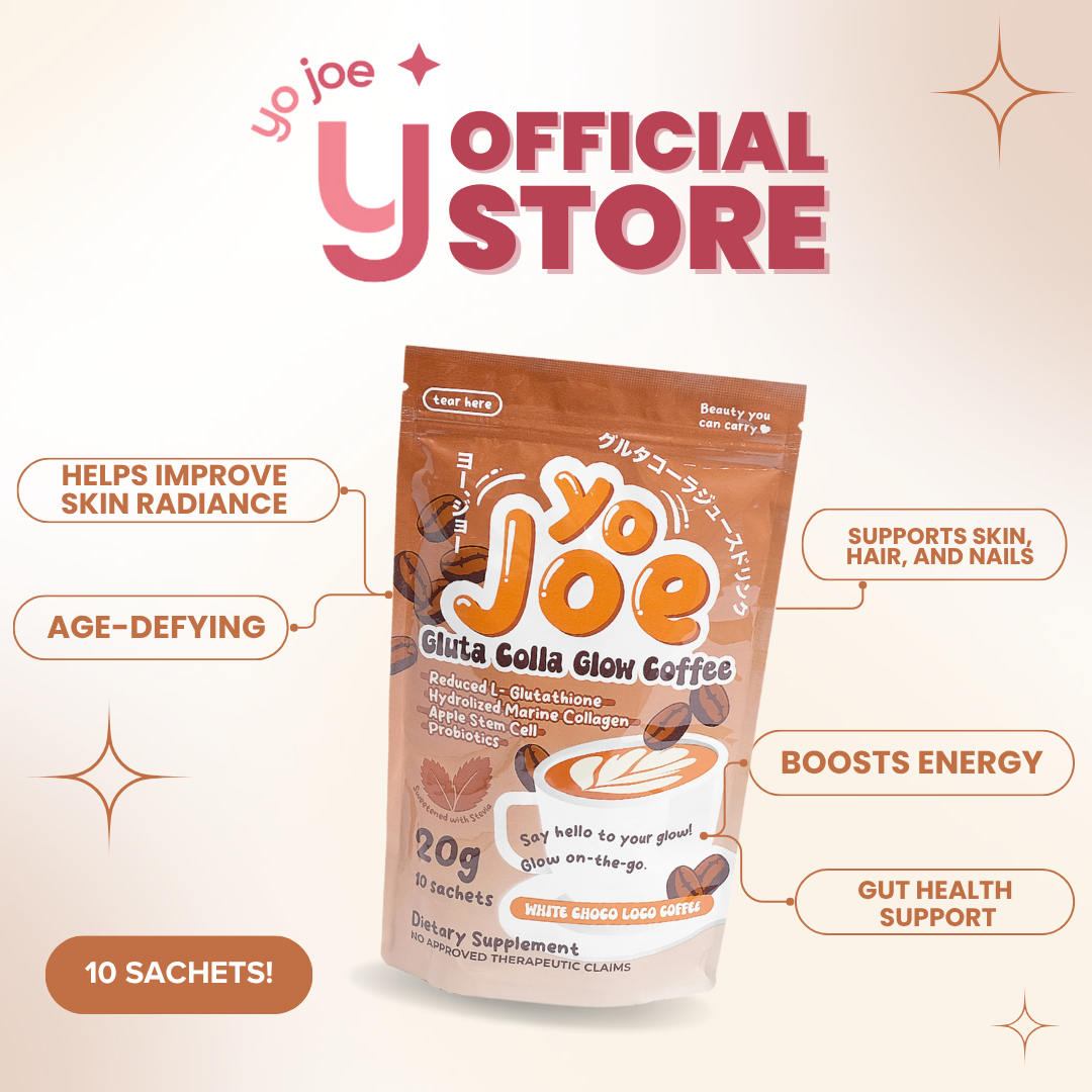 Yo Joe | Gluta Collagen Glow Coffee (White Choco Loco Coffee) Stem Cell Boost & Wrinkle Reduction | 10 Sachets.